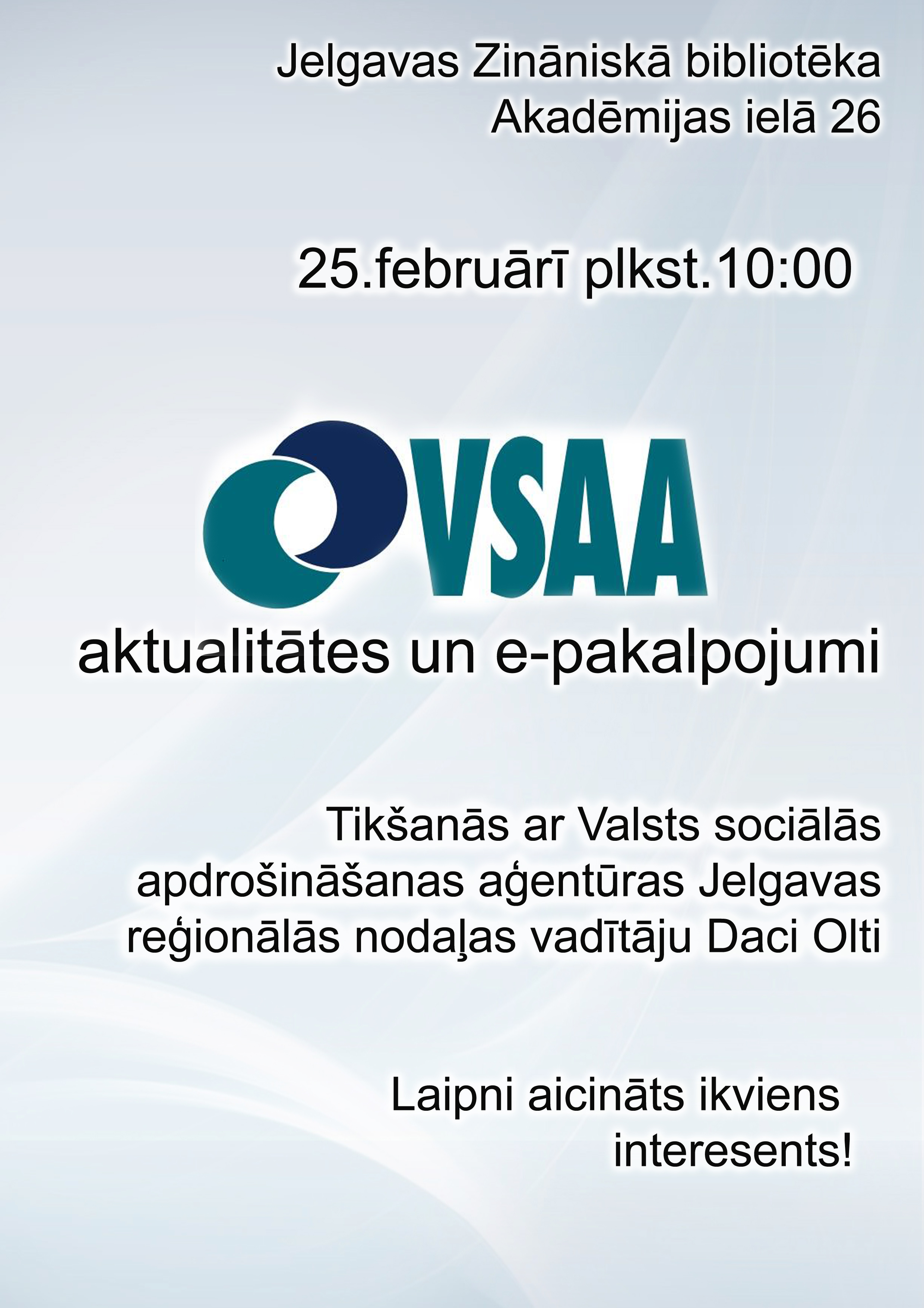 25.februārī pulksten 10:00 Jelgavas Zinātniskajā bibliotēkā tiksimies ar Valsts sociālās aģentūras Jelgavas reģionālā nodaļas vadītāju Daci Olti. Tikšanās tēma "VSAA aktualitātes un e-pakalpojumi". Laipni aicināts ikviens interesents!