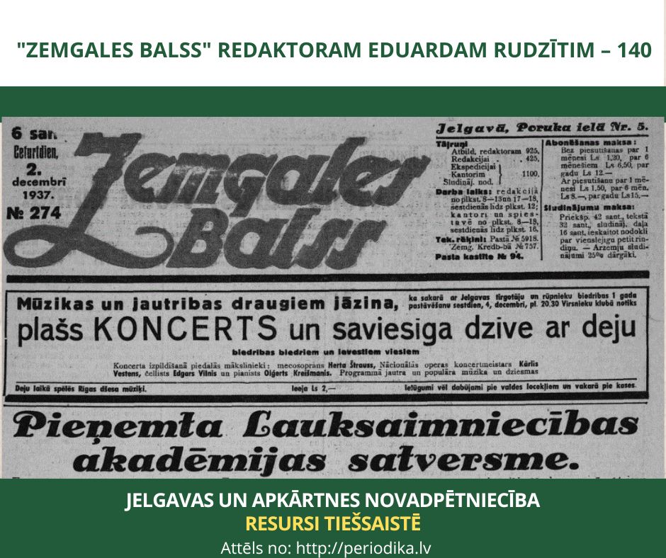 Tā pirms 85 gadiem Jelgavā ziņoja “Zemgales Balss”. Ilgus gadus tās redaktors bija Eduards Rudzītis, kuram 3. decembrī apritētu 140.